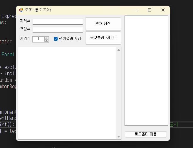 최대 100게임 까지 생성 가능하고 무조건 제외할 수 , 무조건 포함할 수 지정 가능 (콤마 , 로 구분) 단순 번호 생성 및 생성결과 로그파일로 저장(JSON 형식으로 txt 파일로저장) 팀장님이 코딩실력 증진을 위해 이런이런 컨트롤을 사용하고 기능을 넣으라는 걸 과제로 내주셨는데 얼추 완성 된 듯 하다... 앞으로 할 것... 제외수 , 포함수도 JSON 저장 할때 같이 저장하고 리스트박스에서 선택했을때 텍스트박스1,2에 각각 보이게 할 것... 아 참고로 어제 이걸로 번호 만들어서 5등 하나 당첨됨