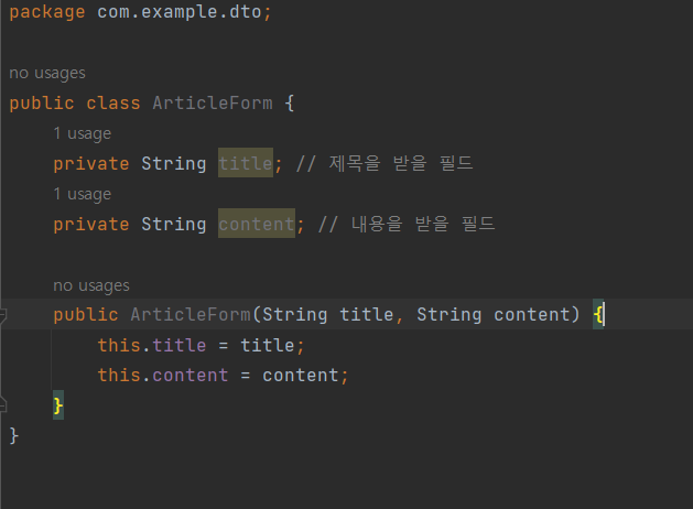 DTO 를 엔티티 로 변환 엔티티 : DB가 자바를 이해할수있게 만드는것 , 테이블 생성 레파지토리:DB를 저장및 관리 공간 ArticleController 에 코드 추가 public String createArticle(ArticleForm form){ System.out.println(form.toString()); //1.DTO를 엔티티로 변환 Article article = form.toEntity(); //2.리파지터리로 엔티티를 DB에 저장 return ""; } entity 패키지 -> Article 클래스 생성 Article 클래스 코드 수정 package com.example.firstproject.entity; import jakarta.persistence.Column; import ..